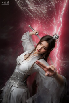 该图像的特色是一个年轻的女人,有着长棕色的头发,配有银色发夹,穿着白色和银色幻想风格的服装,其中包括装甲般的元素和飘逸的织物。她的右手握着一支员工或剑,而左手则用两个手指伸出手势。背景以深色的色调为主导,充满活力,电粉红色和红色闪电效果,营造出动态而强烈的气氛。在场景的上部可见一个发光,错综复杂的标志或符号,增强了梦幻般的强大主题。该组成强调了角色的动态姿势和光和能量的戏剧性相互作用。
