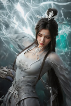 该图像的特色是一个年轻的女子,长长的黑发造型在装饰有银色发夹的高发bun中。她穿着传统,优雅,浅灰色的连衣裙,带有复杂的银色图案和流动的袖子。她的眼睛轻轻地闭上了,脸上有一个宁静的表情。在她的脖子上,她戴着一条银色项链,上面有一个巨大的详细吊坠。背景是一个动态的,空灵的场景,带有旋转,发光的白色和绿色能量图案,给人以神奇或超自然力量的印象。她的肩膀附近有一些角色,还有其他角色在她的腰部。整体美学是戏剧性和神秘的。