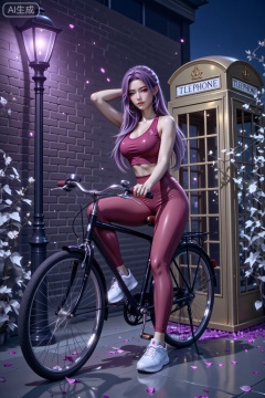 夜晚的场景中,一位紫色长发的女性坐在黑色自行车上,她穿着红色运动背心、同色紧身裤与白色运动鞋,一手扶车把、一手轻搭头部,姿态优雅。背景是深色砖墙,旁有亮着紫光的复古路灯,还有金色的电话亭,周围点缀着白色的藤蔓与散落的花瓣,整体氛围在昏暗光线烘托下,既带复古感又显时尚浪漫