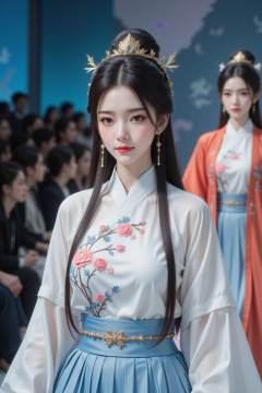 Fuji camera filter,Catwalk,Vogue Runway K-pop models walk the catwalk,young woman,black long hair,brown eyes,smile,full body,simple outfits,turtleneck clothes and a pleated blue skirt,hanfu,embroidery,dao robe,flower paint,and you can see the catwalk when you look from the side.