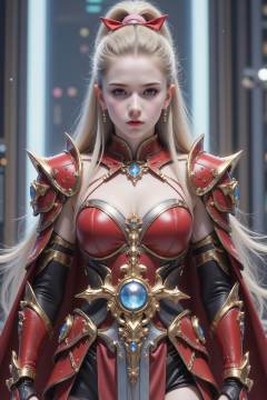 stylized girl with long hair tied in a high ponytail adorned with a pink ribbon and breasts. The character is dressed in intricate red armor with gold accents,including a cape and gauntlets and skirt. They are holding a large ornate sword with a glowing gem orb at its hilt,which is a focal point of the image. The background features a futuristic,high-tech environment with vertical structures and glowing lights,suggesting a sci-fi setting. The character's expression is serious and determined,adding to the overall impression of strength and readiness for action., <lora:20250919_AgainForeignGirlF1Lora:1>