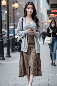 a young woman with long, dark hair, looking at viewer, smile, wearing a light gray cardigan over a gray top and a brown plaid midi skirt. She carries a black handbag over her shoulder and wears white sneakers. She stands on a city street, holding a smartphone, with a white handbag and a woman in a black top and mask in the background.