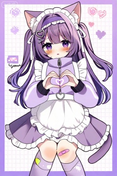 1girl, yunmu, cyan color, white theme,1girl, animal ear fluff, animal ears, apron, bandaid, bandaid on knee, bandaid on leg, blush, border, cat ears, cat girl, feet out of frame, four-finger heart hands, frilled apron, frilled hairband, frilled skirt, frills, grid background, hair ornament, hairband, heart, heart hair ornament, heart hands, jacket, jersey maid, kneehighs, long hair, long sleeves, looking at viewer, maid, outside border, parted lips, pill, purple border, purple eyes, purple hair, purple hairband, purple jacket, purple skirt, purple socks, signature, sitting, skirt, socks, solo, track jacket, two side up, unconventional maid, white apron, white background, x hair ornament, masterpiece, newest