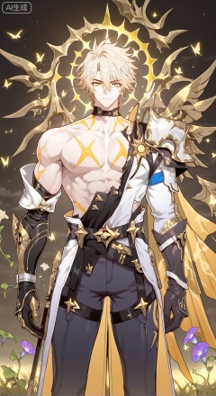 BREAK,,Small note art style,phainon \(khaslana\) \(honkai: star rail\),halo,multiple wings,wings,hair between eyes,golden eyes,heterochromia,abs,toned male,crying with eyes open,yellow wings,asymmetrical wings,black wings,collarbone,pectoral cleavage,cracked skin,halo behind head,sun tattoo,sun symbol,yellow blood,neck tattoo,looking at viewer,short hair,blonde hair,1boy,closed mouth,yellow eyes,male focus