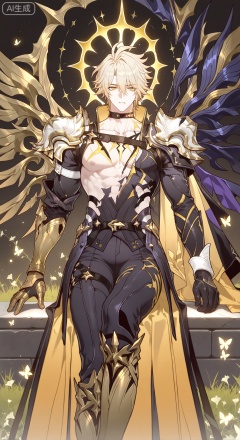 BREAK,,Small note art style,phainon \(khaslana\) \(honkai: star rail\),armour,halo,multiple wings,wings,short hair,golden eyes,blonde hair,phainon \(khaslana\) \(honkai: star rail\)alternate form,heterochromia,abs,toned male,crying with eyes open,yellow wings,asymmetrical wings,black wings,collarbone,pectoral cleavage,cracked skin,halo behind head,sun tattoo,sun symbol,yellow blood,neck tattoo,looking at viewer,bangs,simple background,1boy,hair between eyes,yellow eyes,ahoge,male focus,parted lips,armor,alternate form,phainon \(honkai: star rail\)alternate form