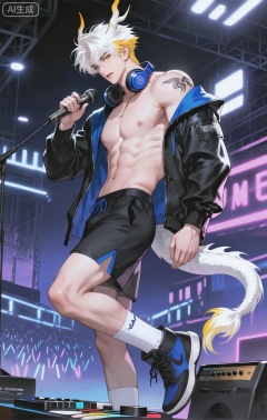 ,xiao zhi tiao,(artist:mazjojo:0.77), (artist:pigeon666:0.70), (artist:zawar379:0.83), (artist:remsrar:0.65), (artist:chimmyming:0.72),masterpiece,best quality,male focus,hd,4kamazing quality,very aesthetic,bust,high resolution,ultra-detailed,perfect lighting,volumetric lighting,,xiaozhitiao,yu xuan,multicolored hair,White dragon tail,White dragon horns,sneakers,white shorts,headphones,tattoo,yellow eyes,white hair,1boy,blonde hair,bangs,white **** top,