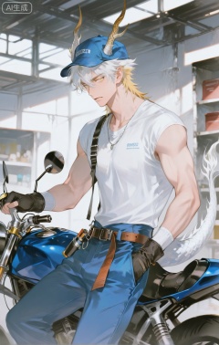 (artist:mazjojo:0.53),(artist:pigeon666:0.37),(artist:zawar379:0.57),(artist:remsrar:0.35),(artist:yoneyama mai:0.64),(yokoyari mengo:0.6),(colored pencil medium),(rei sanbonzakura),(flat color:1.2),masterpiece,best quality,highres,absurdres,extremely detailed,amazing quality,very aesthetic,ultra - detailed,scenery,depth of field,volumetric lighting,high definition,detailed eyes,detailed beautiful face and eyes,best aesthetic,good colors,bright skin,lots of details,1boy,male focus,mechanic - like look,grease - smudged skin,strong build,Anime style,(concentrated expression:1.3),(working on a motorcycle:1.2),(intense eyes),inside a busy 街边修车铺,motorcycles and bicycles in various states of repair, tools scattered on workbenches,(dynamic pose:kneeling beside a motorcycle, wrench in hand),wearing a dark - blue jumpsuit with the top half tied around his waist, revealing a white muscle tee, black work boots,a pair of thick gloves, a mechanic's cap on his head,a toolbox filled with wrenches and screwdrivers nearby, intricate details,jumpsuit and grease details,shop - interior lighting with shadows,cel - shading,anime key visual,ultra HD,8k,Phainon
