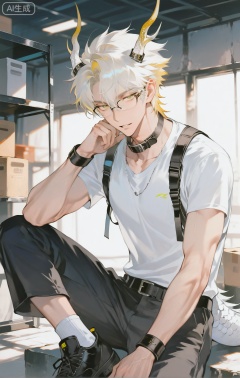 Small note art style,,xiaozhitiao,yu xuan,multicolored hair,White dragon tail,White dragon horns,yellow eyes,white hair,blonde hair,1boy,bangs