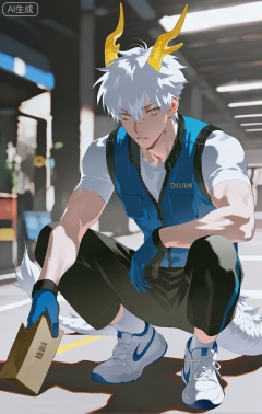 Small note art style,,xiaozhitiao,yu xuan,multicolored hair,White dragon tail,White dragon horns,yellow eyes,white hair,blonde hair,1boy,bangs ,socks,white socks,dianmei