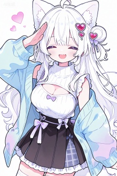 1girl, animal ears, solo, white hair, skirt, breasts, clothing cutout, thighhighs, cleavage cutout, long hair, white thighhighs, closed eyes, animal ear fluff, hair bun, ahoge, simple background, bow, white background, sweater, virtual youtuber, black skirt, smile, cleavage, fang, cat ears, open mouth, open clothes, skin fang, sleeveless, hair ornament, salute, jacket, zettai ryouiki, single side bun, frills, plaid, cowboy shot, turtleneck, heart hair ornament, blush, frilled skirt, facing viewer, medium breasts, ribbon, long sleeves, one side up, heart, blue jacket, blue bow, large breasts, pleated skirt, off shoulder, purple bow, open jacket, miniskirt,fox tail