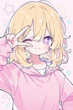 1girl, one eye closed, solo, blonde hair, star \(symbol\), hood, star-shaped pupils, hoodie, v, purple eyes, looking at viewer, smile, upper body, medium hair, symbol-shaped pupils, collarbone, simple background, blush, long sleeves, hood down, closed mouth, pink hoodie, :3, v over eye, pink background, pink nails, hair between eyes, nail polish