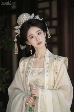 Song Dynasty, High-definition, beautiful woman of the Song Dynasty, elegant and noble, dignified and graceful, gentle and generous, with a peaceful expression, dressed in splendid clothes and adorned with jewels and jade, dignified and imposing. High definition, high contrast, saturation