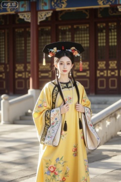 The empress of the Qing Dynasty, with a dignified and beautiful face, has a gentle and dignified front face, clear and bright eyes, a straight nose bridge, and slightly pursed red lips. Wearing a luxurious black velvet crown, the red velvet beads are dazzling and the eastern pearls are shining brightly. Dressed in bright yellow court robes, the robes were embroidered with exquisite patterns and the silk threads shone with golden light. [Exercise Description] : Standing upright and steady outside the palace gate, solemn and dignified. Outside the grand palace, tall and imposing palace gates stand tall, and the white marble steps shine in the sunlight. [Technical Requirements] : The camera moves horizontally at a constant speed, and the intense and concentrated light highlights the empresss frontal expression as well as the elaborate details of the yellow court dress.