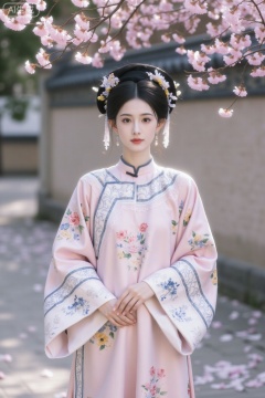 A 20-year-old girl, a delicate Qing Dynasty woman with updo hair, cold white skin, luxurious headwear, exquisite makeup, pink Qing Dynasty princess dress, palace walls, plum blossoms, panoramic view, high-definition picture quality, frontal photo, distant view, close-up shot of the upper body of the person. The artistic conception is beautiful and elegant, dignified and refined. Extraordinary temperament.