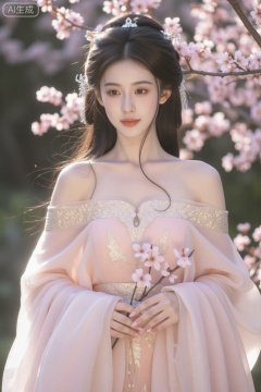 The off shoulder gold embellished Warring States style robe features a melancholic expression design and a super realistic high-definition texture skin effect; The soft lighting effect creates a romantic atmosphere like peach blossoms. The model is wearing a transparent dress, holding peach blossoms in her hands, with an elegant posture and a gentle smile on her face; The makeup is natural, with light pink as the main color tone, paired with blooming peach blossoms, forming a highly narrative composition. The image adopts a shallow depth of field effect and soft blurring processing, and the artistic composition technique makes the entire scene appear dreamlike. The rich texture details create a peaceful and tranquil atmosphere, fully showcasing the unique charm and exquisite elegance of Chinese culture. The entire work is filled with a dreamlike atmosphere, showcasing unparalleled aesthetic value in both color matching and detail processing.