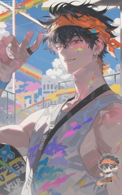 (artist:mazjojo:0.83), (artist:pigeon666:0.67), (artist:zawar379:0.77), (artist:remsrar:0.65), (artist:yoneyama mai:0.74), (artist:chimmyming:0.72), masterpiece, 4k, hd, HDR, amazing quality, best quality, high resolution, goldenfieldszho, newest, very aesthetic, ultra-detailed, absurdres, perfect lighting, volumetric lighting, (bright daylight), shadowing, (good shadowing), depth of field, scenery, amazing aesthetics, cinematic lighting, cinematic, shading, (good shading), counter_shading, subsurface scattering, intricate details, illustration, perfect hands, handsome, 1boy, solo, male focus, bishounen, long hair, hair between eyes, (black hair with orange streaks:1.3), (brown eyes:1.3), triumphant grin, toned male, skinny, (bandana tied on forehead:1.4), ear piercings, jewelry, multiple necklaces, skull earrings, ear chain, multiple rings, v, colorful graffiti print hoodie, (paint splatters:1.4), off-shoulder hoodie, white **** top, (standing on a skateboard:1.5), multicolored background, (blue sky background:1.4), (concrete background:1.4), (skate park background:1.3), (colored shadow:1.5), orange shadow, upper body, close-up, dynamic pose, dynamic angle, beautiful background, detailed background, magazine cover, (fake cover:1.8), (chibi inset:1.9), glint, lens flare, light particles, Chip7SKTest