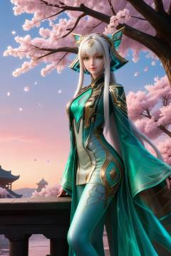 <lora:少司缘-巫礼祀神Pony:0.7>,1girl,long,flowing white hair,green eyes,headpiece,luxurious,high-collared,form-fitting teal and gold,with intricate patterns outfit,high collar,long,flowing sleeves,matching green high-heeled boots,masterpiece,best quality,solo,1girl,petals,looking at viewer,moon,branch,cherry blossoms,flower,extreme aesthetic,(quasarcake:0.7),masterpiece,best quality,good quality,newest,very aesthetic,absurdres,A shot with tension,(Visual impact,giving the poster a dynamic and visually striking appearance:1.2),impactful picture,offcial art,colorful,splash of color,movie perspective,