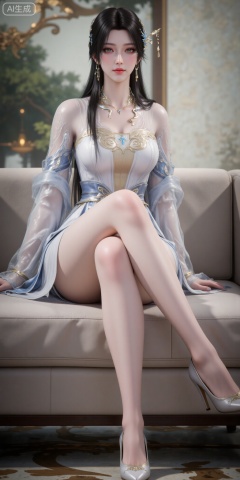 1girl, solo, sitting, white dress, bare legs, high heels, dress, jewelry, hair ornament, crossed legs, long hair, full body, couch, necklace, black hair, legs, earrings, looking at viewer, long sleeves, blue eyes,