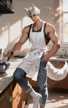 wearing (a short, frilly white apron tied around his waist:1.5), (a grey **** top:1.3), (jeans:1.2), (white ankle socks:1.4),(nine fluffy white fox tails, wagging playfully:1.5),