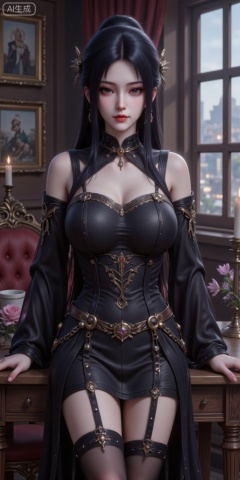 1girl, solo, long hair, breasts, looking at viewer, blue eyes, large breasts, black hair, hair ornament, thighhighs, long sleeves, dress, jewelry, closed mouth, standing, ponytail, cowboy shot, earrings, black thighhighs, indoors, black dress, clothing cutout, window, garter straps, chair, table