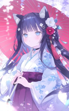 masterpiece,absurdres,best quality,loli,petite,high quality,chromatic_aberration,//,best, 1girl, solo, umbrella, oil-paper umbrella, hair ornament, japanese clothes, black hair, flower, holding, long hair, kimono, holding umbrella, red umbrella, hair flower, animal ears, blue eyes, wide sleeves, tassel, hakama, upper body, floral print, long sleeves, blue flower, hakama skirt, white kimono, skirt, red flower, white flower, print kimono, very long hair, blurry, closed mouth, pink flower, parted lips, cat ears, blurry foreground, purple hakama, depth of field, choker, floating hair, hairclip, blunt bangs, looking up, pink umbrella, looking at viewer, black hakama, chinese zodiac, tassel hair ornament, sash, obi, transparent, nail polish, blush, ribbon, jewelry, fingernails, purple flower, braid, bow, blue hair, bell, blue kimono, necklace, animal ear fluff, hanfu, purple theme, expressionless, outdoors, hair ribbon, new year//,<lora:guimao2025.10.24——【noob】hans:1>,