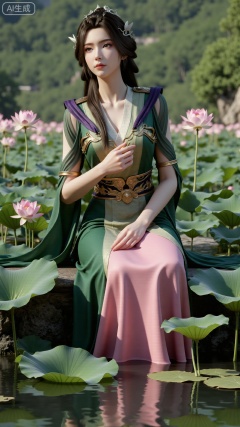 masterpiece,1girl,long hair,(Sitting by the lotus pond in the garden:1.3),(long dress:1.3),beautiful face,short sleeves,holding flower,looking at viewer,(huge breasts:2.99),(full breasts:2.99),