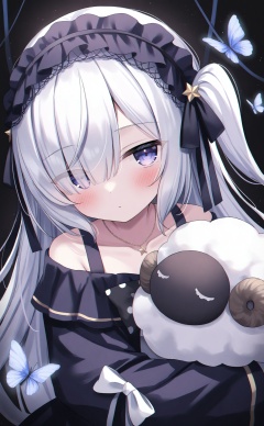 masterpiece,absurdres,best quality,loli,petite,high quality,chromatic_aberration,//,natsume_an-an, 1girl, bug, solo, lolita_hairband, purple_eyes, long_hair, butterfly, necklace, jewelry, stuffed_toy, collarbone, hairband, book, stuffed_animal, white_hair, dress, hair_over_one_eye, ribbon, bow, one_side_up, frilled_hairband, black_ribbon, closed_mouth, headdress, sheep, black_hairband, frills, black_dress, hugging_object, long_bangs, looking_at_viewer, white_bow, off_shoulder, holding, upper_body, black_bow, star_\(symbol\), blush//,//,<lora:natsume_an-an——【noob】hans:0.5>,<lora:guizhencao2——【noob】hans:0.5>,