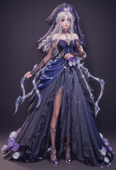 (full_body:1.1),(looking at viewer:1.1),facing viewer,direct gaze,<lora:YQ_pony_nuannuan36_V4:0.8>,q1528437228,1girl,solo,jewelry,long hair,white hair,purple eyes,dress,hair flower,hair ornament,makeup,earrings,gloves,ring,eyepatch,petals,purple lips,bridal gauntlets,pointy ears,blue eyes,grey hair,high heels,one eye covered,choker,pantyhose,long dress,bridal veil,fingerless gloves,necklace,fine fabric emphasis,bow,braid,eyeshadow,BREAK simple background,pure black background,black background,perfect anatomy,