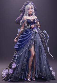 (full_body:1.1),(looking at viewer:1.1),facing viewer,direct gaze,<lora:YQ_pony_nuannuan36_V4:0.8>,q1528437228,1girl,solo,jewelry,long hair,white hair,purple eyes,dress,hair flower,hair ornament,makeup,earrings,gloves,ring,eyepatch,petals,purple lips,bridal gauntlets,pointy ears,blue eyes,grey hair,high heels,one eye covered,choker,pantyhose,long dress,bridal veil,fingerless gloves,necklace,fine fabric emphasis,bow,braid,eyeshadow,BREAK simple background,pure black background,black background,perfect anatomy,