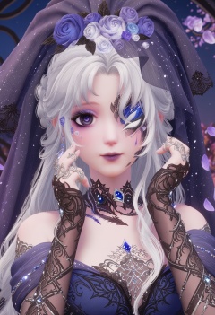 (upper_body:1.2),(looking at viewer:1.1),masterpiece,(best quality),smog,Dark room,dim lighting,peach blossom,falling petals,<lora:YQ_Illustrious光辉v5_暖暖36_V1:0.8>,q1528437228,1girl,solo,jewelry,long hair,white hair,purple eyes,dress,hair flower,hair ornament,makeup,earrings,gloves,ring,eyepatch,petals,purple lips,bridal gauntlets,pointy ears,blue eyes,grey hair,high heels,one eye covered,choker,pantyhose,long dress,bridal veil,fingerless gloves,necklace,fine fabric emphasis,bow,braid,eyeshadow,