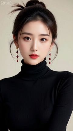 这是一幅精美的写真,描绘了一位年轻女性。她拥有深色的头发,梳成了一个高高的发髻,部分头发垂在脸颊两侧。她的耳朵上戴着一对长款的耳环,耳环由多个小巧的红色宝石组成,与她的红色口红相呼应。她穿着一件黑色的高领上衣,衣领紧贴颈部,显得非常简洁和优雅。背景是浅色的,没有明显的装饰,使得人物更加突出。整体画面给人一种高雅、精致的感觉,人物的妆容和服饰搭配得当,展现了她的美丽和优雅。