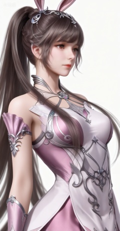 1girl, solo, animal ears, rabbit ears, pink dress, metal collar, upper body, ponytail, collar, brown hair, white background, hair ornament, dress, closed mouth, long hair