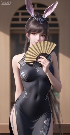 ,xiaowu,1girl,solo,dress,hair ornament,ponytail,rabbit ears,brown hair,animal ears,realistic,
