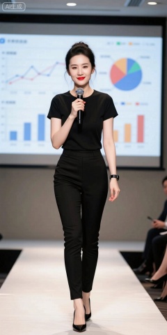 A woman is giving a lecture or sharing on the catwalk. She is wearing a black short - sleeved top with a smartwatch on her right hand, paired with black tight pants and black high heels. She holds a microphone with an elegant and confident gesture. She has a slender waist and long legs, looking neat and capable. On the projection screen behind her are data graph images. It's a formal occasion such as a business meeting, training lecture or work report. She has delicate makeup, bright red lipstick, excellent skin texture, gentle eyes, and a brilliant smile, facing the camera. Soft natural light, ultra - high definition, sharp focus on the face, 8K resolution, realistic, best quality,masterpiece