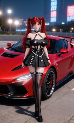 <lora:王牌竞速-神剑号车姬Pony:0.7>,1girl,long,vibrant red hair,twintails,red eyes,provocative,gothic-inspired outfit,black,off-the-shoulder crop top,cutouts,short,pleated mini skirt,choker,belt adorned with silver chains,thigh-high stockings and black high-heeled shoes,red car,looking at viewer,sports car,full body,vehicle focus,standing,