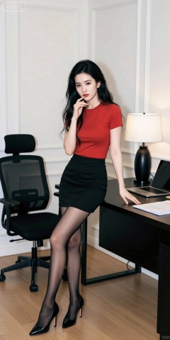 This is a high-resolution photo depicting an Asian woman posing seductively in an office setting. Her skin is fair and delicate, with long black curly hair cascading over her shoulders like a waterfall. She wears a form-fitting red T-shirt, paired with a slim black skirt that accentuates her slender legs, along with pure black pantyhose and black high heels. Leaning slightly against a black table, she places her right hand on the table edge while her left hand rests near her face, with the index finger gently touching her lips. Her expression exudes both charm and confidence. The background features a refined office interior: light wood flooring and white wall paneling. A black office chair with a mesh backrest and armrests sits on the left side of the image. On the table, a modern black table lamp with a white lampshade casts warm light, accompanied by a laptop and several documents. The overall environment is modern and elegant..photo taken with a Canon EOS R6 Mark II Mirrorless camera in the style of 35mm f/8 aperture, intricate details.dlrb,hsw,wet,water,large natural breast,soft breasts,zlyhuge Breasts