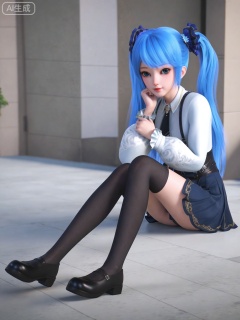 score_9,score_8_up,score_7_up,1girl,solo,looking_at_viewer,realistic,photorealistic,(full body:0.5),blue eyes,blue hair,pleated skirt,white shirt,twintails,black thighhighs,black footwear,