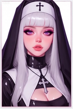 a digital illustration shoot from a portrait camera angle about a portrait of a young woman dressed as a nun with long, straight white hair and striking makeup, wearing a black and white nun outfit with a cross on her head and a cross necklace, the image also shows a close-up portrait of the subject, a 20-year-old woman with pale skin and long, silver hair, who appears to be looking directly at the viewer with a neutral expression, she has large, expressive purple eyes with dramatic eye makeup, and her lips are parted slightly, revealing a hint of her cleavage, her outfit consists of a black habit with a white veil and a black choker with a silver cross pendant, the background is a plain white, and the image has a soft, pastel color palette with a glossy finish,