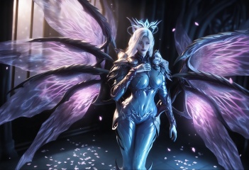 masterpiece,best quality,amazing quality,very aesthetic,high resolution,ultra-detailed,absurdres,scenery,photorealistic,(looking at viewer:1.1),(Dark room:1.3),(moody lighting:1.1),peach blossom,falling petals,(large breasts:1.2),nancheng,1girl,solo,white hair,armor,wings,purple lips,long hair,blue eyes,purple eyes,bodysuit,closed mouth,shoulder armor,makeup,glowing,halo,blue skin,colored skin,high heels BREAK photorealistic details,<lora:QQSillnanchengV1:0.8>,