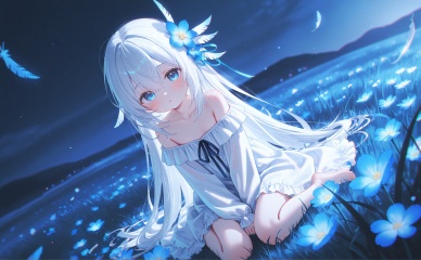 masterpiece,very aware,highres,absurdres,newest,best quality,loli,petite,high quality,chromatic_aberration,cinematic_angle,dutch angle,night,//,umehara,konya666,//,1girl,solo,long hair,looking at viewer,blush,bangs,blue eyes,hair ornament,long sleeves,dress,ribbon,hair between eyes,bare shoulders,sitting,very long hair,collarbone,flower,white hair,outdoors,parted lips,barefoot,hair flower,off shoulder,white dress,sleeves past wrists,wariza,frilled dress,grass,aged down,feathers,white flower,child,between legs,blue flower,hand between legs,female child,feather hair ornament,