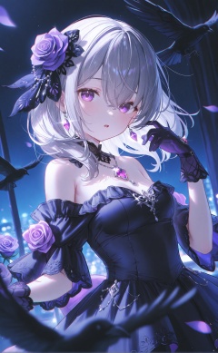 masterpiece,very aware,highres,absurdres,newest,best quality,loli,petite,high quality,chromatic_aberration,cinematic_angle,dutch angle,night,//,umehara,konya karasue,//,1girl,gloves,bird,hair ornament,hair flower,breasts,crow,jewelry,flower,earrings,purple eyes,solo,gem,upper body,looking at viewer,grey hair,rose,dress,bare shoulders,frills,necklace,purple gemstone,black flower,purple flower,black gloves,open mouth,glint,purple gloves,purple rose,hand up,black dress,medium hair,off shoulder,large breasts,