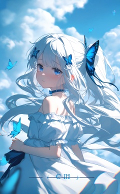masterpiece,highres,absurdres,newest,best quality,high quality,loli,petite,chromatic_aberration,//,,High quality 8k,1girl, solo, long hair, looking at viewer, blush, bangs, blue eyes, hair ornament, dress, ribbon, bare shoulders, closed mouth, hair ribbon, ponytail, white hair, frills, sky, choker, puffy sleeves, looking back, cloud, tears, off shoulder, white dress, english text, floating hair, crying, bug, butterfly, crying with eyes open, blue theme, off-shoulder dress, butterfly hair ornament, blue butterfly//,<lora:konya_karasue2——【noob】hans:0.8>,