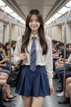 The image is a high-resolution photograph,A photograph of an girl with fair skin,standing on a subway train. She has straight long hair,and wears a white blouse,striped tie,and a blue short pleated skirt. She was carrying a black shoulder bag,with a confident expression and a smile on her face. Other passengers are seated in the background. The subway car has metal poles and advertisements on the walls.,