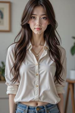 1girl, solo, long hair, looking at viewer, brown hair, shirt, hair ornament, navel, brown eyes, jewelry, pants, necklace, blurry background, denim, jeans, realistic, photo background