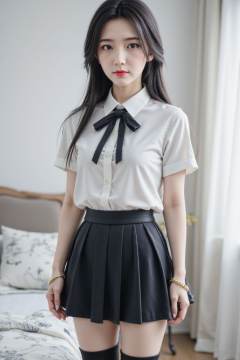 A young Asian woman is standing and facing the viewer, slightly off-center to the left in a medium shot. She appears to be in her early twenties. She wears a white, short-sleeved collared shirt with a black bow tie, a black pleated mini-skirt, and black over-the-knee socks. A gold bracelet is visible on her left wrist. She has long, straight black hair with bangs, fair skin, and red lipstick. Her facial expression is neutral. The background is a plain white wall and a portion of a bed with patterned linens on the left side. The lighting appears to be natural, creating soft shadows. The overall composition is clean and simple. The style is somewhat suggestive, with emphasis on the woman's figure and clothing. <lora:20251026_TinFlux1_5_Epoch10:1>