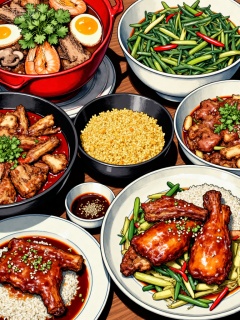 Realistic style of food illustration,Subject: A table full of Chinese dishes,, Dish details:,, Top left large pot: Red broth dish,containing shrimp,fried egg,sliced cured pork,mushrooms,topped with cilantro,, Top right bowl: Stir-fried green leafy vegetables, next small bowl: yellow crumbled rice-like food (possibly fried rice or mixed grains),, Bottom left black pot: Stir-fried spare ribs,accompanied by green onions,red peppers,white sesame seeds,with a bright red color,, Bottom right plate: Chicken leg rice,with braised chicken leg on white rice,accompanied by vegetables,drizzled with brown sauce,, Bottom left small bowl: Dark-colored seasoning sauce,containing sesame seeds and chili flakes,, Style: Realistic illustration,delicate lines,rich colors,highlighting the abundance and temptation of Chinese dishes.,, Negative prompt: ng_deepnegative_v1_75t,(badhandv4:1.2),EasyNegative,(worst quality:2),,nsfw, Steps: 30, Sampler: Euler, CFG scale: 7.0, Seed: 2122092973, Size: 768x1024, Model hash: 8cba4f1ef4, Model: F.1基础算法模型-哩布在线可运行_F.1-dev-fp8.safetensors, Denoising strength: 0, RNG: CPU, Lora 1: 而已, Lora Hash 1: de715ed38f, Lora Weight 1: 0.8, vae_name: automatic