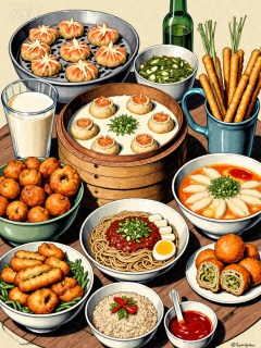 Realistic style of food illustration,Chinese breakfast illustration), Main subject: A rich Chinese breakfast, Food details:, Steamer: Baozi, shrimp dumplings, Bowls: Soy milk, tofu pudding (with sauce and green onions), wonton noodles, noodles (with tofu cubes and green onions), Special snacks: Fried dough sticks, pan cakes (rolled with vegetables and meat threads), fried rice, pickled vegetables, tea eggs, Seasoning: Red chili sauce, Style: Retro-style illustration, color aging, bold lines, full of the atmosphere of street breakfasts., Negative prompt: ng_deepnegative_v1_75t,(badhandv4:1.2),EasyNegative,(worst quality:2),,nsfw, Steps: 30, Sampler: Euler, CFG scale: 7.0, Seed: 1832765731, Size: 768x1024, Model hash: 8cba4f1ef4, Model: F.1基础算法模型-哩布在线可运行_F.1-dev-fp8.safetensors, Denoising strength: 0, RNG: CPU, Lora 1: 而已, Lora Hash 1: de715ed38f, Lora Weight 1: 0.8, vae_name: automatic