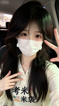氛围感。轻松的感觉,超低分辨率,日常快照有噪音,没有特定的构图和灯光,随意拍摄的感觉,一个长发,双低马尾的女孩,她的皮肤白皙,坐在车内,穿着文化衫上绣着三个汉字“考米袋”,戴着口罩,看着镜头微笑,做出可爱的手势。,松弛感