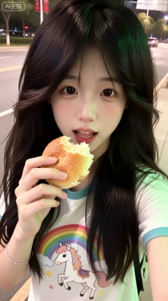 氛围感。轻松的感觉,超低分辨率,日常快照有噪音,没有特定的构图和灯光,随意拍摄的感觉,一个长发女孩,她的皮肤白皙,上学路上,啃馒头,穿着阳光彩虹小白马图案的T恤。