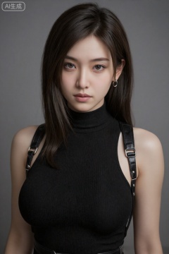 这是一位年轻亚洲女性的高度逼真的数码肖像,她拥有深棕色的长直发和白皙的皮肤。她有杏仁状的棕色眼睛、小鼻子和丰满的嘴唇,表情中性。她穿着一件黑色无袖罗纹高领上衣,突出了她中等大小的乳房,透过布料可以看到乳头。她的服装是肩上挂着黑色皮革吊带。她的左耳上戴着一只银耳环。背景是简单的灰色渐变,将焦点吸引到她的脸部和上半身。图像具有柔和、逼真的质感,微妙的灯光突出了她的面部特征。